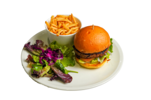 8oz homemade AAA lean beef burger with sunny-side-up egg, cheddar cheese, romaine lettuce, tomatoes, pickles, caramelized onions, smoked bacon on a toasted bunNote: Vegan options available